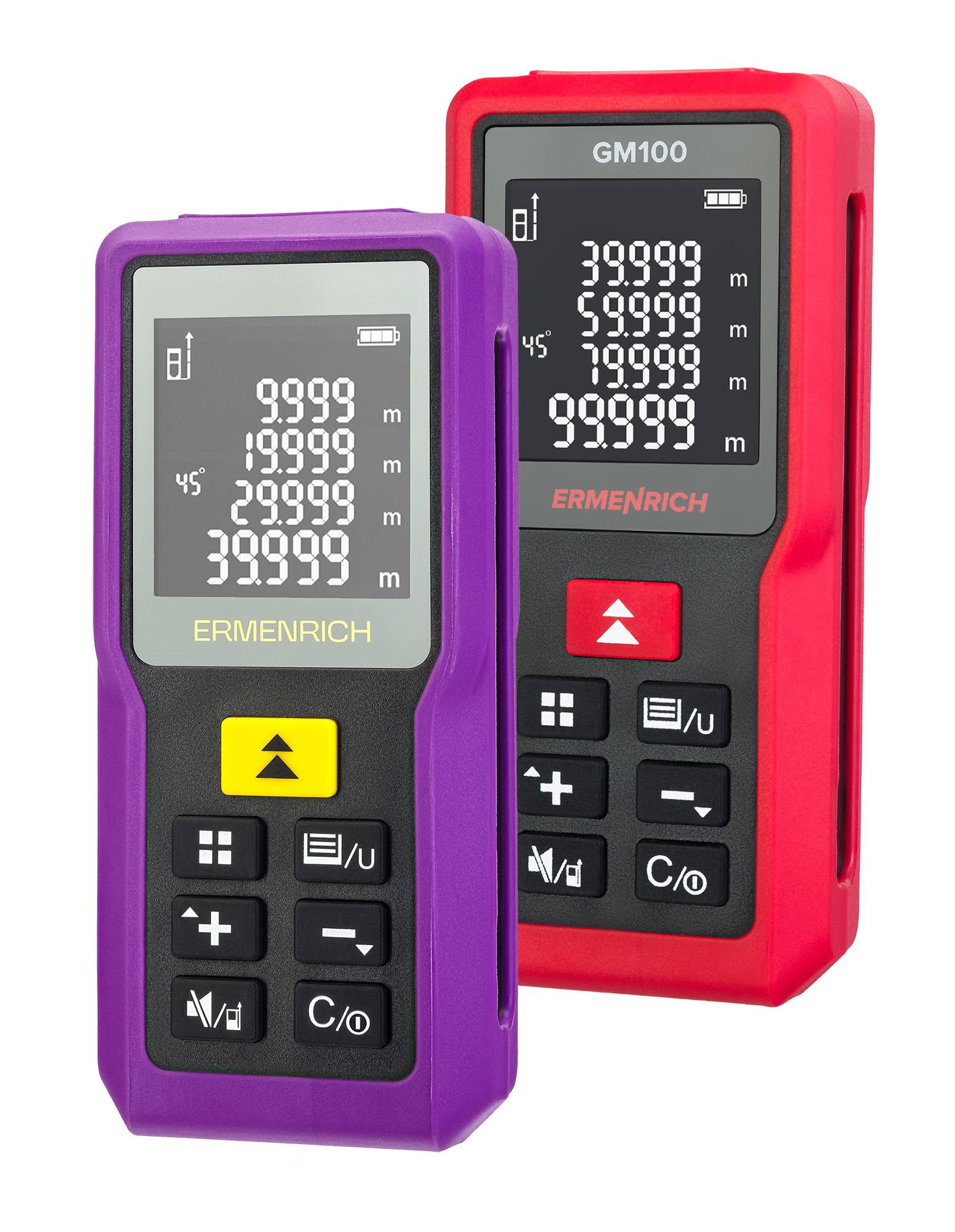 L’Ermenrich Reel PRO GM100 è un misuratore laser progettato per effettuare misure nei cantieri edilizi e durante i lavori di ristrutturazione. Può essere usato anche per le misure dei confini catastali e per le misure dei terreni, nonché per qualsiasi altra applicazione che necessiti di misure precise delle dimensioni lineari di un oggetto, della sua area o del suo volume. La massima distanza misurabile è pari a 100 metri. Il misuratore laser può effettuare anche misurazioni angolari. Grazie alla funzione teorema di Pitagora, lo strumento calcola automaticamente le distanze basandosi su delle misure intermedie. Questa funzione è particolarmente utile quando non è possibile posizionare il laser in modo da puntare il raggio laser lungo la direzione che si desidera misurare.