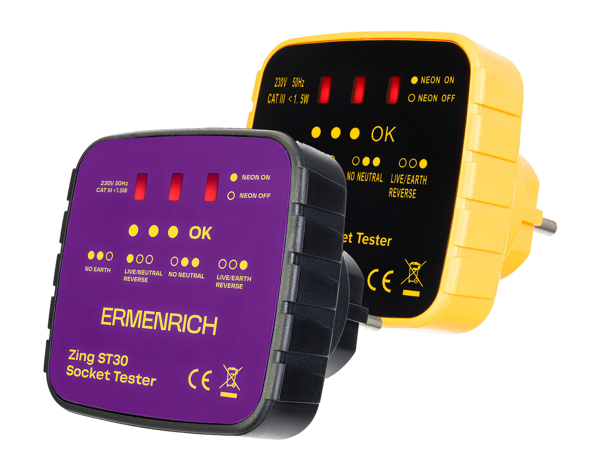Il tester per prese elettriche Ermenrich Zing ST30 è progettato per controllare la tensione e il corretto collegamento dei cavi di ogni presa elettrica. Il tester va inserito direttamente nella presa e sarà il lampeggiare della luce a indicare l’eventuale presenza di anomalie nel circuito elettrico: mancanza di terra/neutro, inversione neutro/fase o inversione fase/terra. In aggiunta, lo specifico codice di colori che compare sullo schermo del tester segnala il collegamento corretto dei cavi. Il significato di ogni codice è riportato direttamente sullo strumento.
