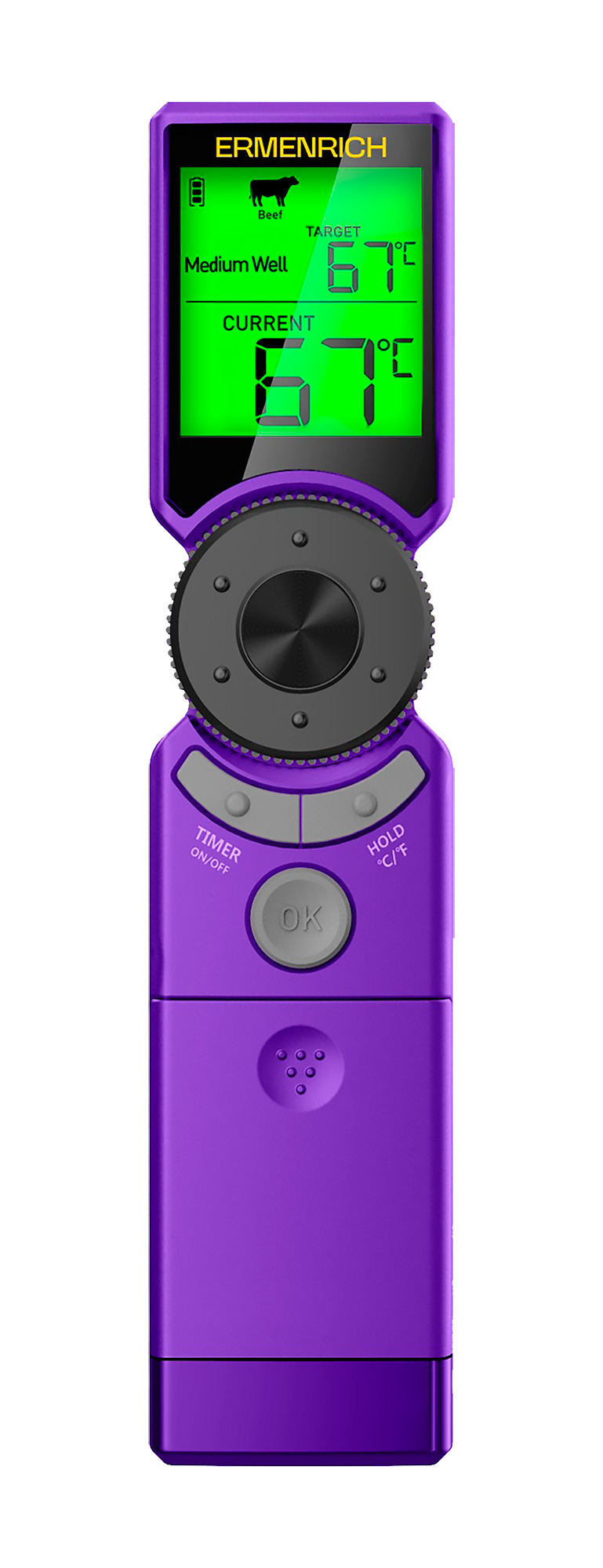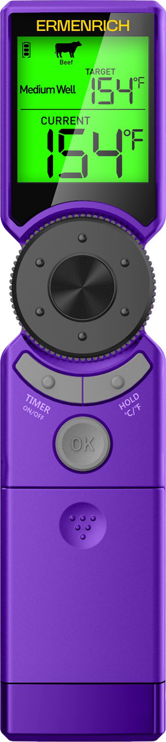 Scoprite Ermenrich BBQ GT10, il vostro nuovo compagno di cucina intelligente. Con esso, qualsiasi carne, che si tratti di pollo succoso, tacchino magro, bistecca di manzo o agnello succulento, verrà cucinata esattamente come la volevate. Il termometro è dotato di programmi preimpostati per i tipi di carne più comuni, suggerendo automaticamente la temperatura ideale e il tempo di cottura target per